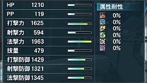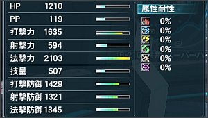 HP581.6 打撃力465 射撃力418.2 法撃力533.2 技量397.4 打撃防御433 射撃防御432.6 法撃防御454